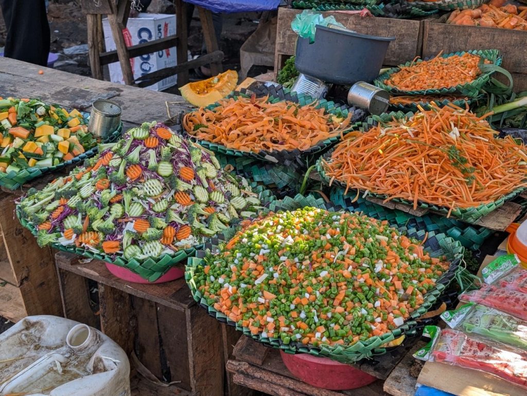 Dans les marchés, la valeur ne se cache pas seulement dans le produit, mais dans le soin apporté au geste : petits pois déjà écossés, macédoines de légumes prêtes à l’emploi, paniers colorés soigneusement agencés. C’est une “convenience food tropicale”, artisanale, fraîche, joyeuse. Et c’est aussi une manière de dire que l’alimentation, c’est de l’attention donnée à l’autre.